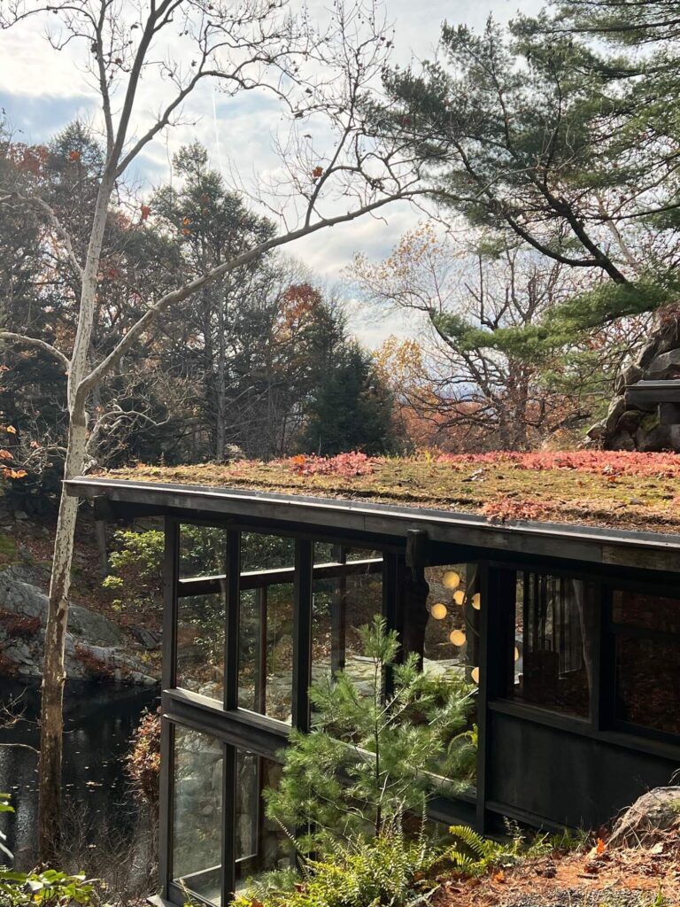 On a crisp autumn day last month, a group from MR was invited by our friends at R & Company with whom we have been working for over a decade, to visit Manitoga to see the exhibition of work by one of the artists they represent and whose pieces we have used in numerous projects—Jeff Zimmerman: Glass Light Nature. Arriving at the remote property, we made our way to the Guide House where we met our tour guide Rhiannon, who after a quick introduction, brought us to the start of a winding trail of rocky terrain that would lead us to Dragon Rock. Along the way, she encouraged us to feel the moss that carpets much of the ground in soft, bright green, and talked about Russel’s commitment, with inspiration from the Wappinger people, to restoring the land to its original landscape, in order to help others make sense of the “subtle and seemingly chaotic world of the Northeastern deciduous forest.” Manitoga, she told us, means Place of Great Spirit. From a mid-point on the trail, we stood directly across from the house, which is located on the quarry edge, built into the earth and nestled in the woods. It is clear, studying this view, that it was designed with intention, around a central theme of connecting nature with the architecture. At the end of the trail, at the top of the hillside, we stood above the quarry pool with its 30-foot waterfall, the modern house built primarily of wood, glass and stone just before us. At eye level, the roof, covered in lush sedum plantings was in perfect view. Lowering our gaze, we got a peak at the interior through the façade of glass.