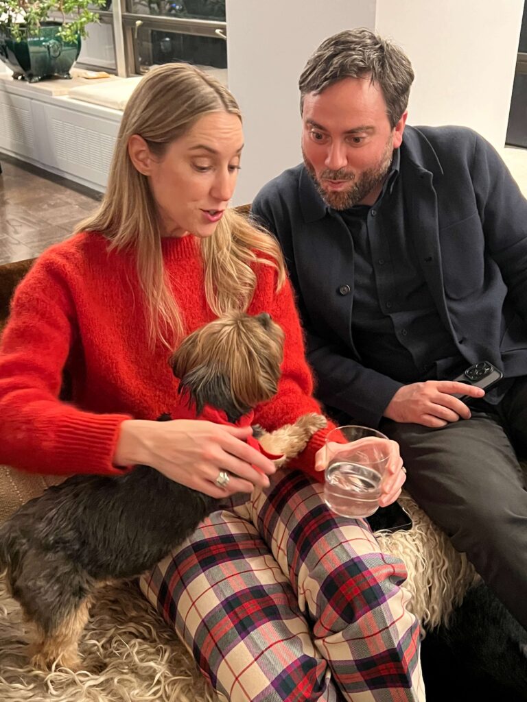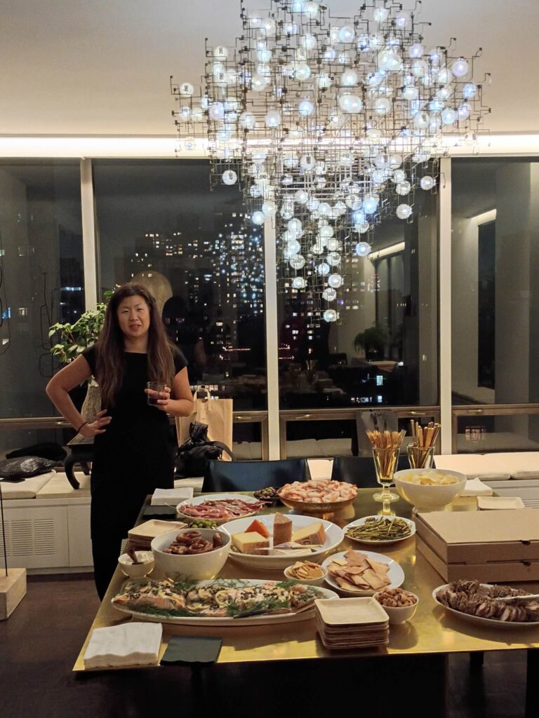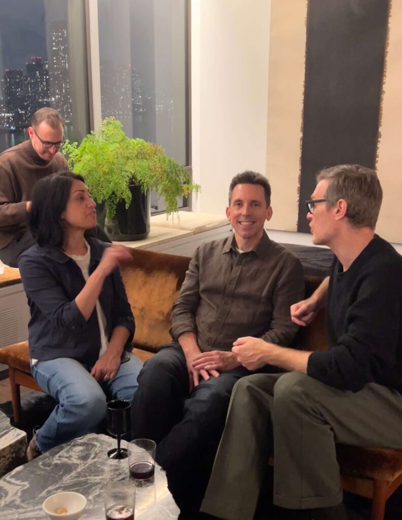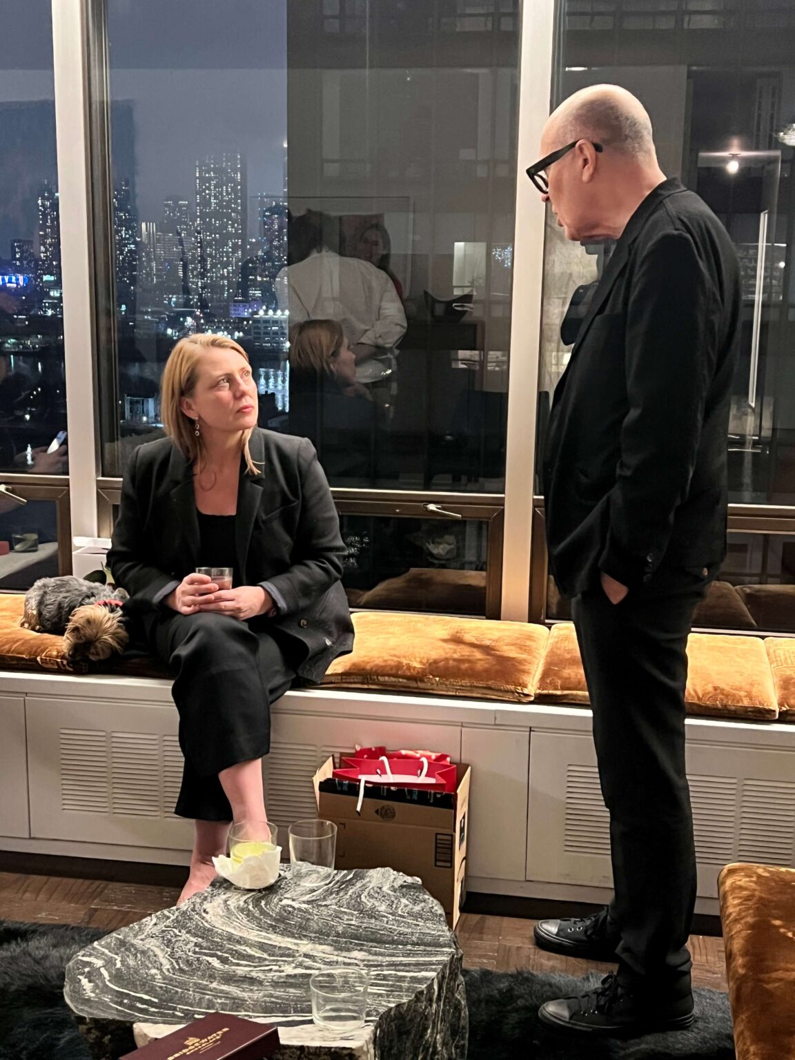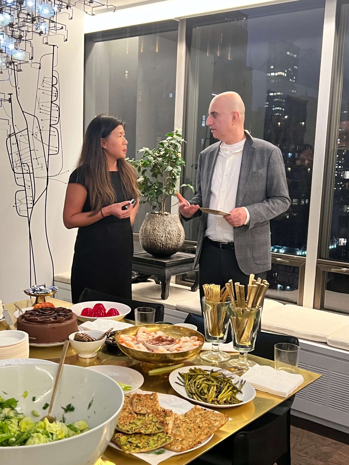 Walking through the building’s grand, red-carpeted lobby on our way to the elevators, we marveled at how being there feels like a trip back in time to when Truman Capote, Richard Avedon, Dina Merrill, Johnny Carson and Walter Cronkite were among the famous names who called the address home. David and Fritz’s apartment, on the other hand, feels present-day. Renovated in 2014, the materials and surfaces in black and white provide a modern backdrop for furniture, furnishings, objects and art in a warm, natural palette in browns and greens. With city lights sparkling through wrap-around windows, we mingled easily from room to room, our hosts’ perfectly balanced minimalist-maximalist home as comfortable as it is chic.