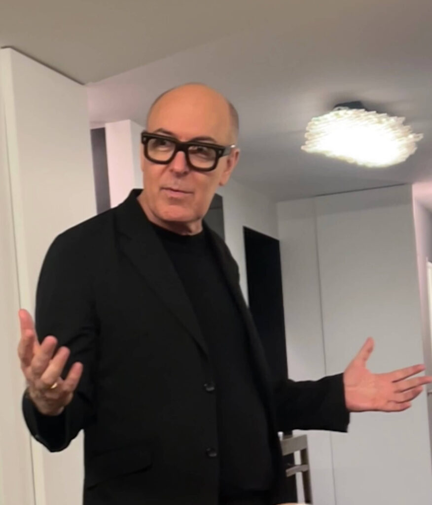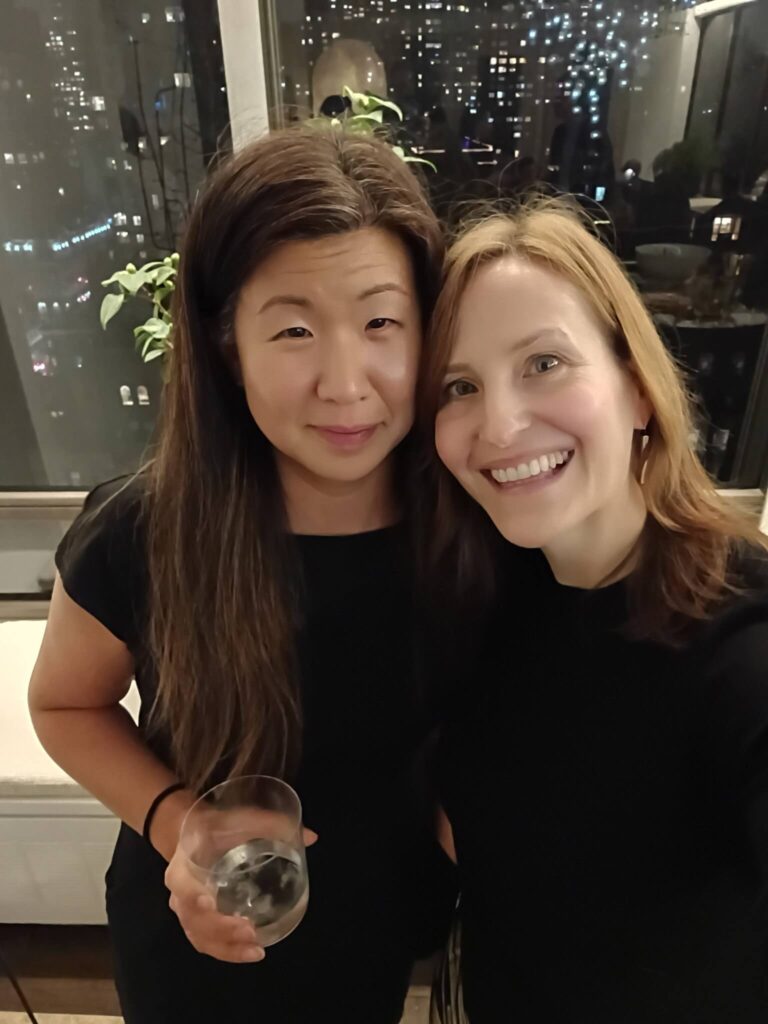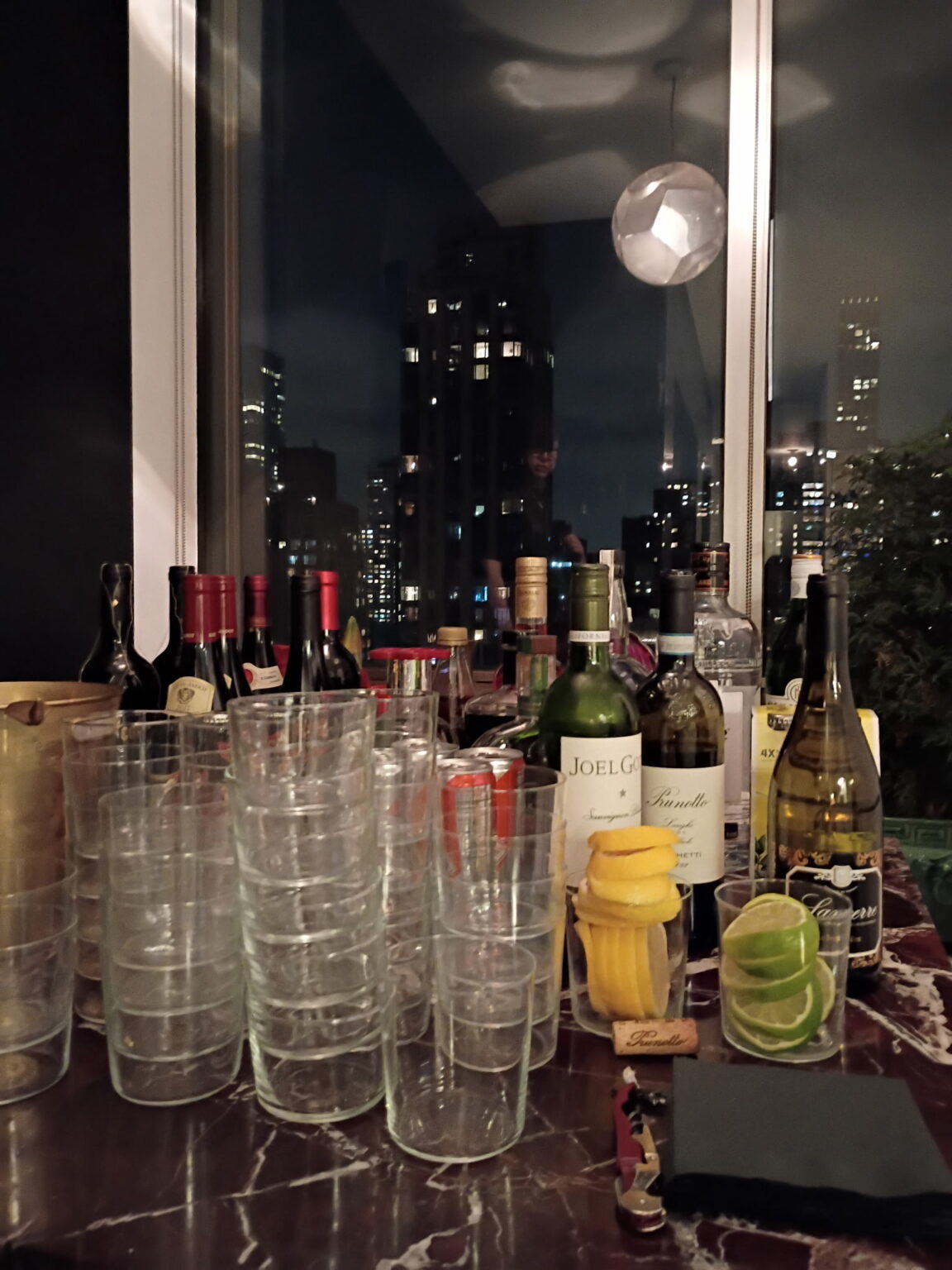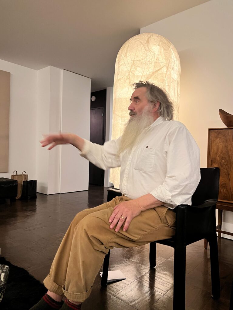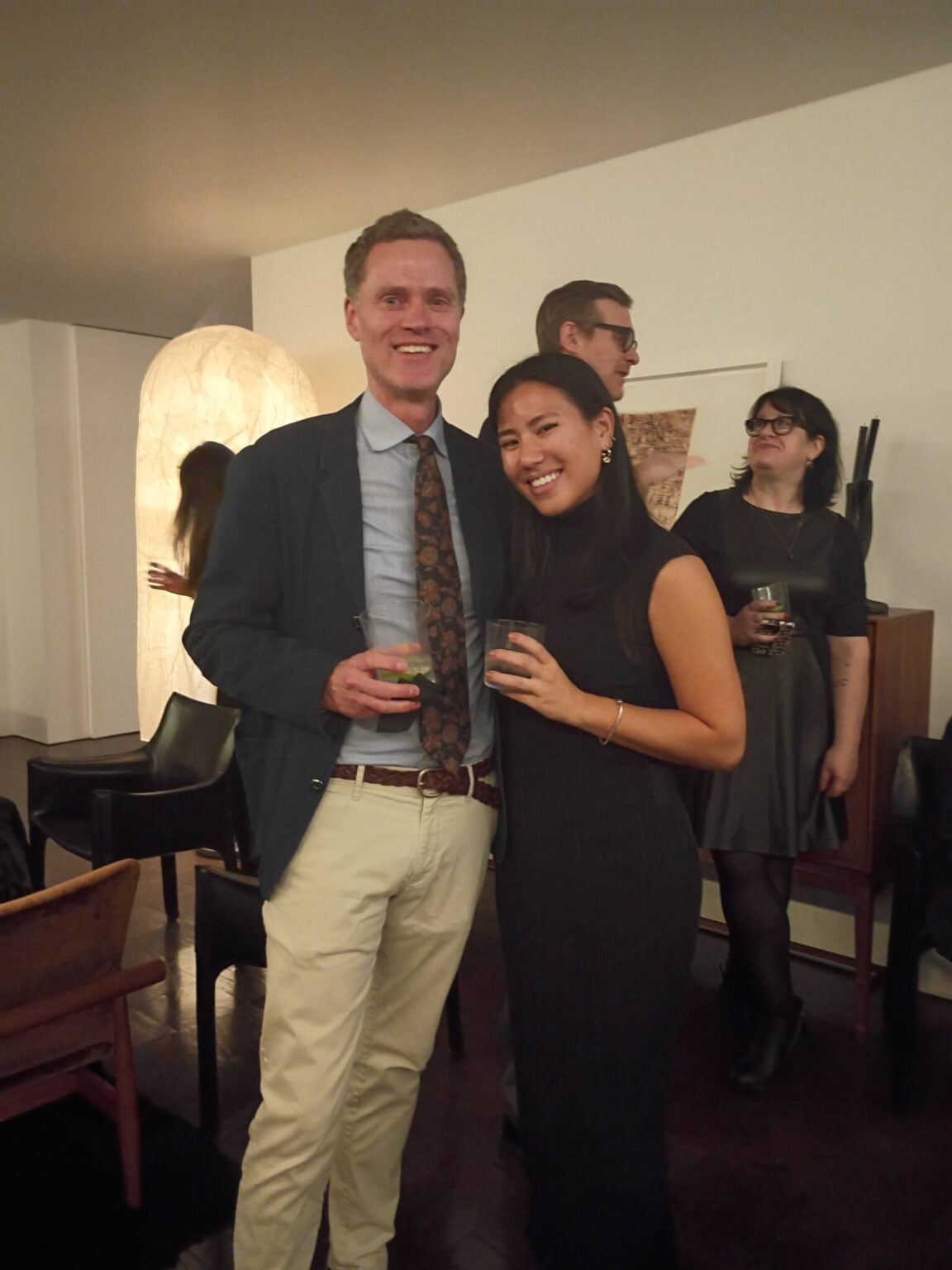 Walking through the building’s grand, red-carpeted lobby on our way to the elevators, we marveled at how being there feels like a trip back in time to when Truman Capote, Richard Avedon, Dina Merrill, Johnny Carson and Walter Cronkite were among the famous names who called the address home. David and Fritz’s apartment, on the other hand, feels present-day. Renovated in 2014, the materials and surfaces in black and white provide a modern backdrop for furniture, furnishings, objects and art in a warm, natural palette in browns and greens. With city lights sparkling through wrap-around windows, we mingled easily from room to room, our hosts’ perfectly balanced minimalist-maximalist home as comfortable as it is chic.