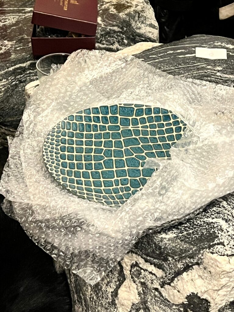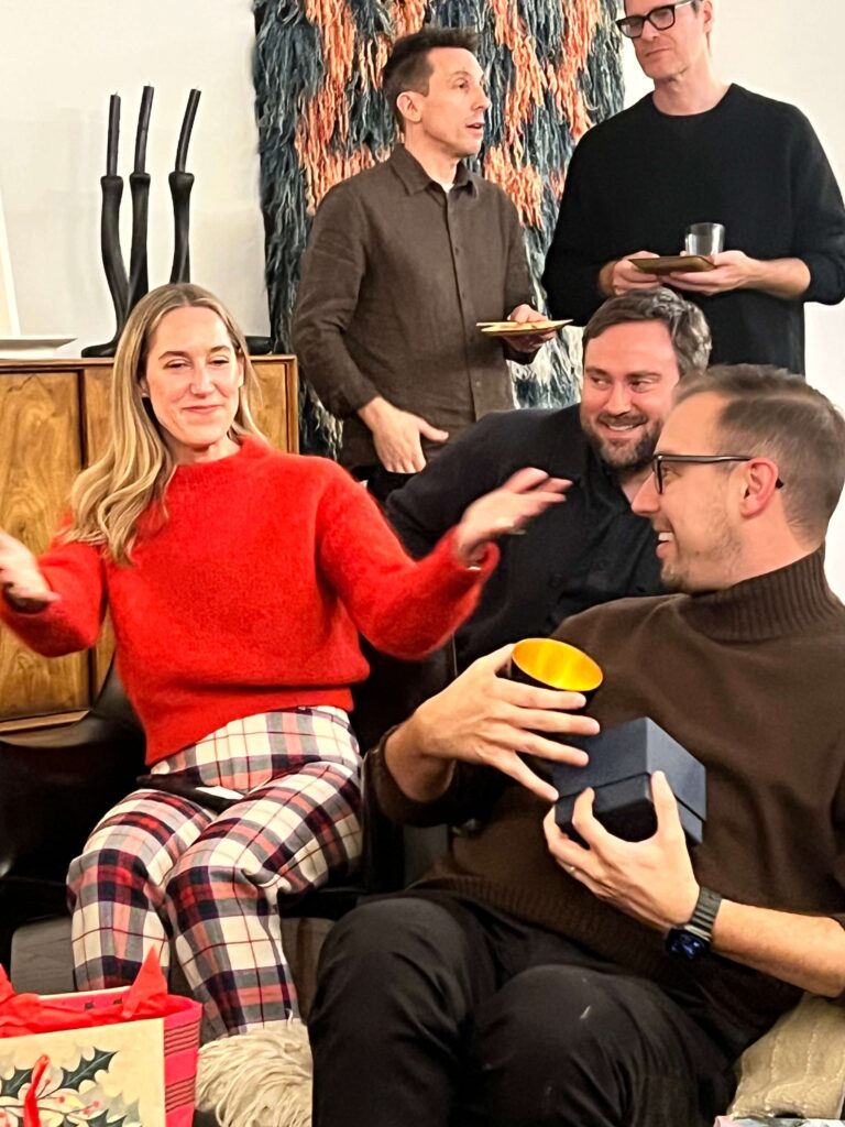 At the end of the night, along with our office mascots Tulip and Apple, we gathered in the living room for an MR-style White Elephant game, with gifts targeted for the design lover. Included in the array were objects both beautiful and interesting, including a glass tea set, a verdigris catch-all and a pair of handmade plates from Japan. A few of the items got the attention of more than one of us, creating some friendly competition with a handful of surprising steals.